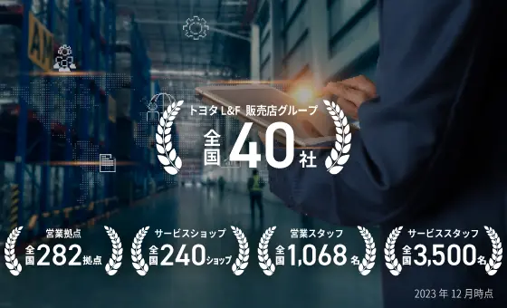 全国に40社あるトヨタL&F販売店グループは、全都道府県に合計282の拠点を持ち、地域に密着したきめ細かなサポートを提供します。フォークリフトはもちろん、工場や倉庫の保管効率を向上する保管カイゼン、また自動化・省人化に関するお困りごとに対し、地域に密着したスタッフが課題解決のお手伝いをいたします。